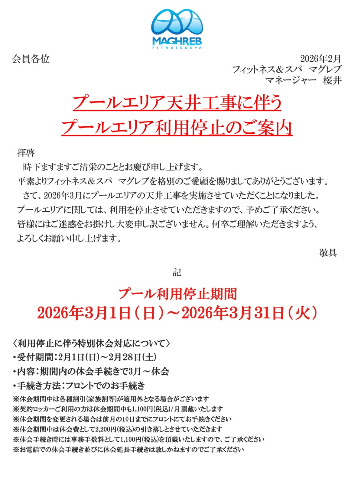 フィットネス&スパ マグレブをご利用いただき、誠にありがとうございます。